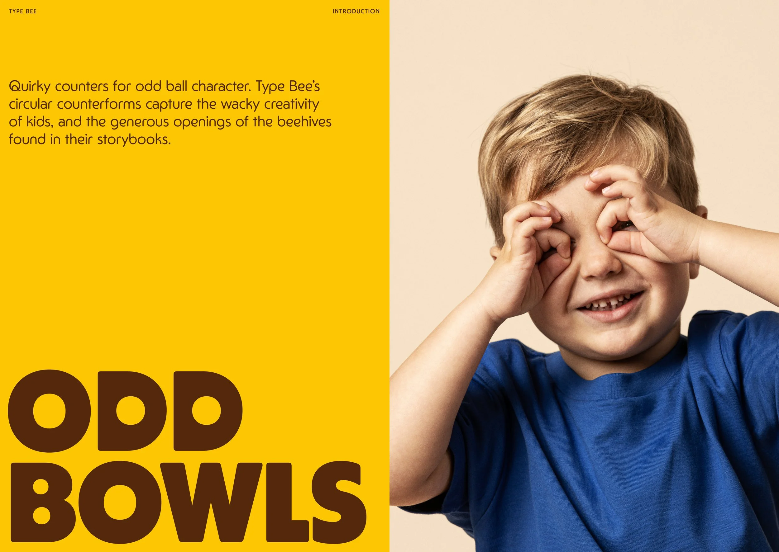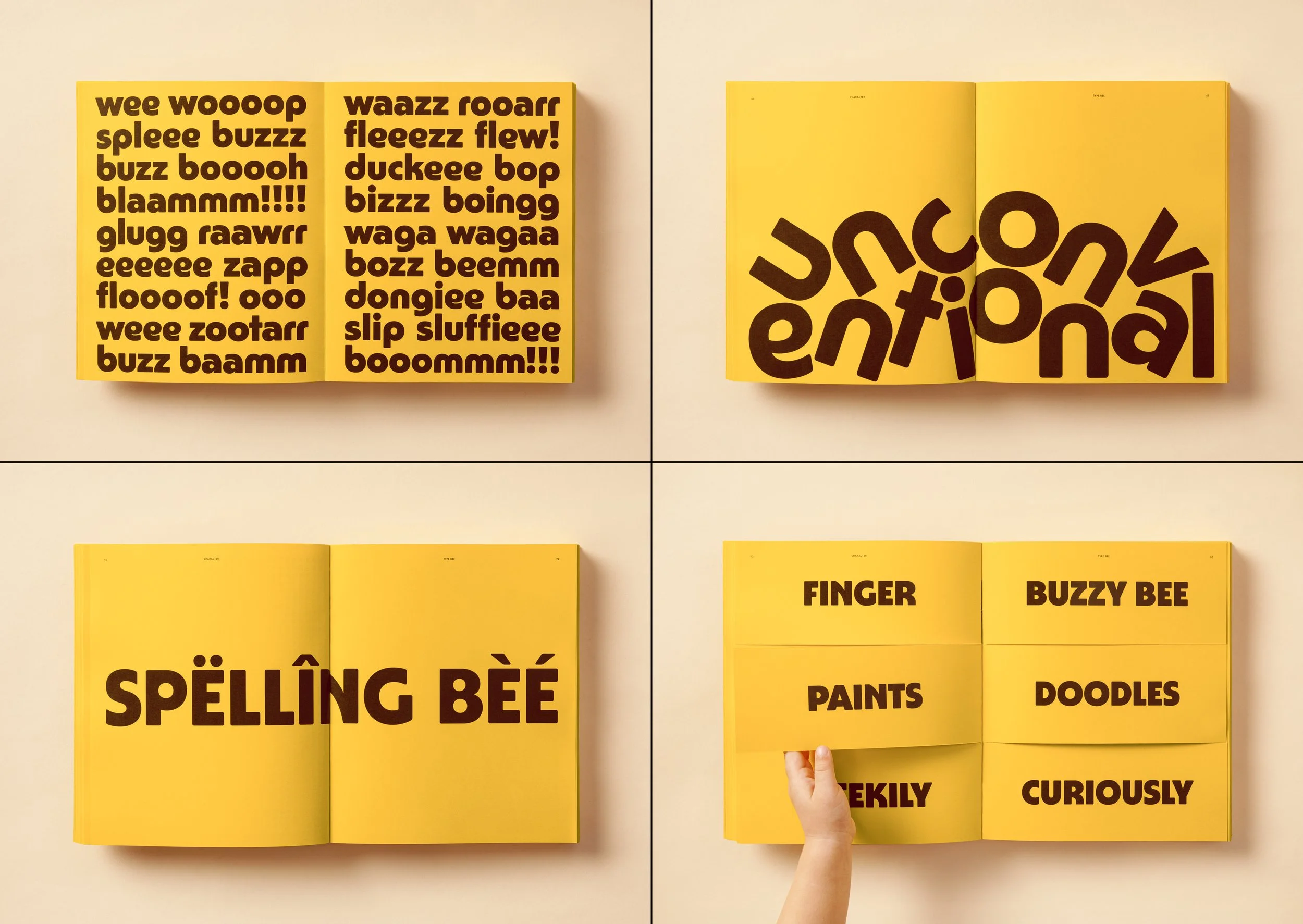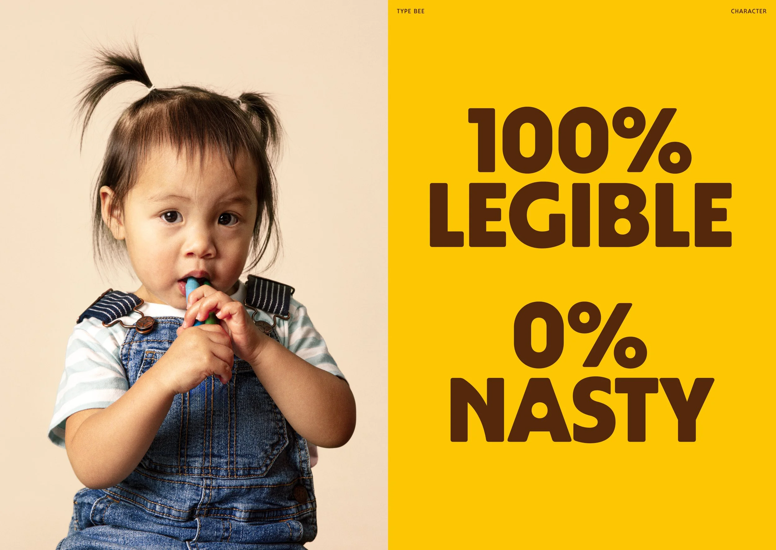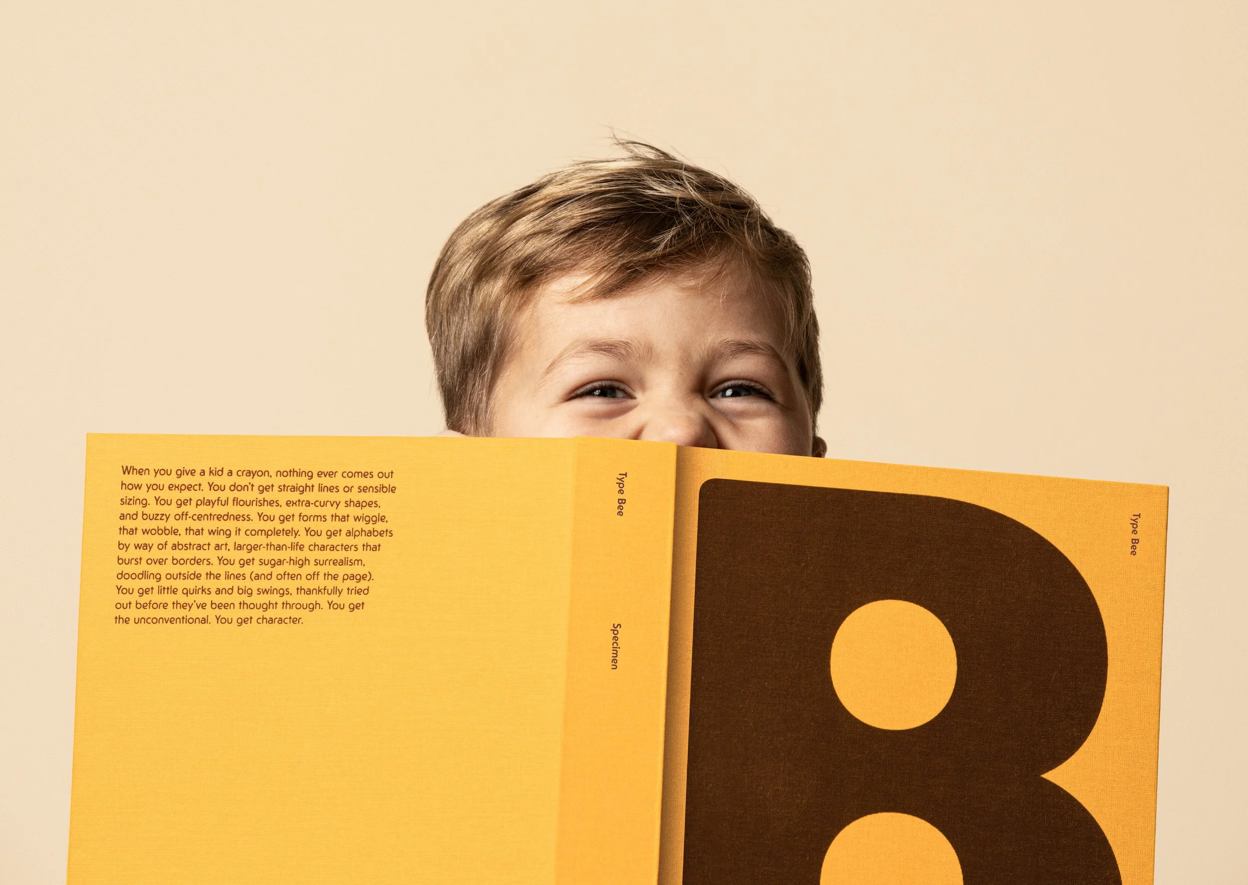 To best capture the spirit of Type Bee, we needed a specimen book that could showcase the vibrancy and versatility of the typeface, while seizing every opportunity for moments of play. Structured like a children’s picturebook, the Type Bee specimen is designed to both demonstrate and delight in equal measure. Each page invites the reader to engage with Type Bee like a child might – with peek-a-boo details, die-cuts, foldouts, hidden messages, and tactile surprises throughout.